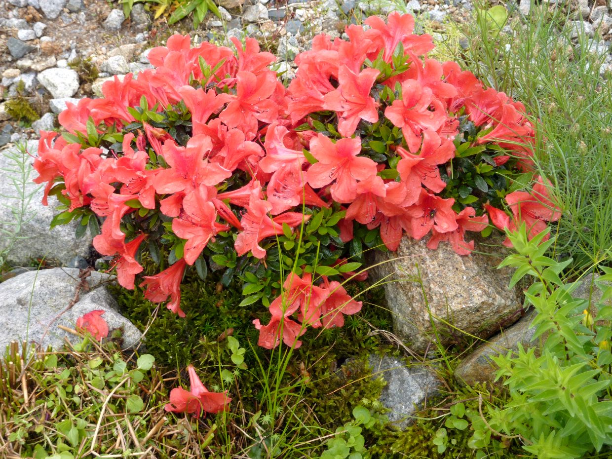 | Rhododendron hirsutum ( Alpinum 2010 groß neu 2013 ) | Bewimperte Alpenrose | Vollsonnig | Gemisch aus Nadelwaldboden, Hochmoortorf und Sand 1/1/1. Im Frühjahr kommt dann etwas neuer Hochmoortorf unter die Pflanzen | 5 | rosa | 30 - 50 cm |