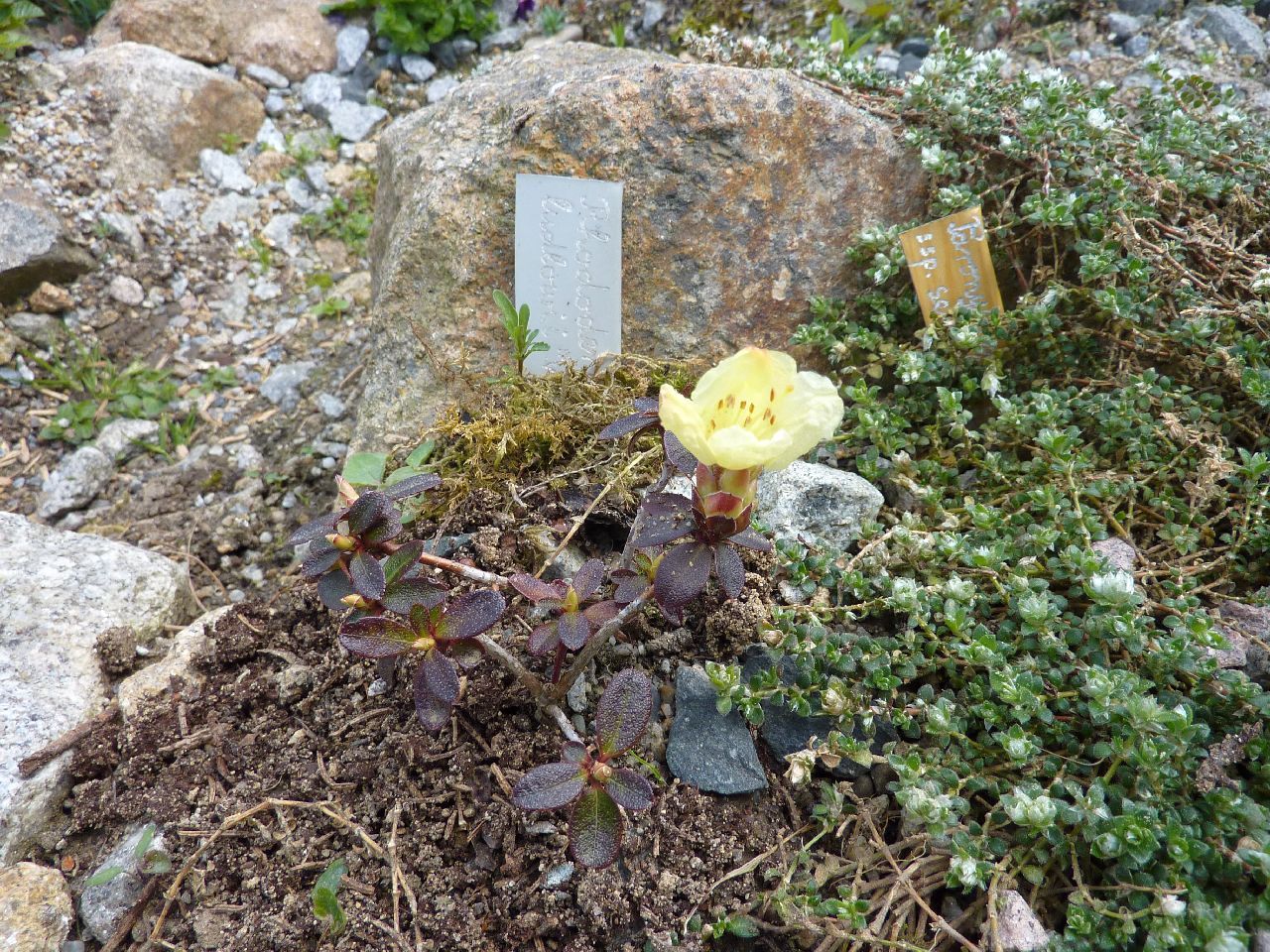 | Ramonda myconi syn. Ramonda pyrenaica Alba ( Alpinum 2009 neu 2015 ) | Pyrenäen-Felsenteller | Halbschattig | frisch ,gut durchlässig Gartenerde/Walderdemix, Sorgfältige Standortwahl in absonnigen Fugen | 6 - 7 | weiß mit gelben Auge | 10 cm |